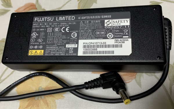 純正のAC電源アダプタ DC19V 6.3A が無いので、手持ちの 19V 6.32A(富士通製品) の電源を使用しています。