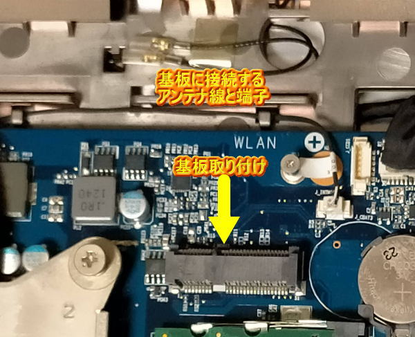 メモリ取り付け部分の少し上に無線LANユニット取り付けスパースと端子があります。