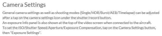 | Camera Settings General camerasettings as well as shooting modes (Single/HDRBurst/AEB/Timelapse) can be adjusted after atap on the camera settings icon under the shutter/record button. An exposure info panelis also shown at the top of the videoscreen when connected to the aircraft. To set the ISO/Shutter Speed/Aperture/Exposure Compensation, tap on the Camera Settings button, then "Exposure Settings". |