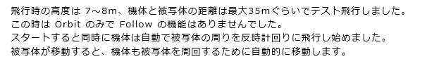 | 飛行時の高度は7~8m、機体と被写体の距離は最大35mぐらいでテスト飛行しました。 この時は Orbitのみで Follow の機能はありませんでした。 スタートすると同時に機体は自動で被写体の周りを反時計回りに飛行し始めました。 被写体が移動すると、機体も被写体を周回するために自動的に移動します。 |