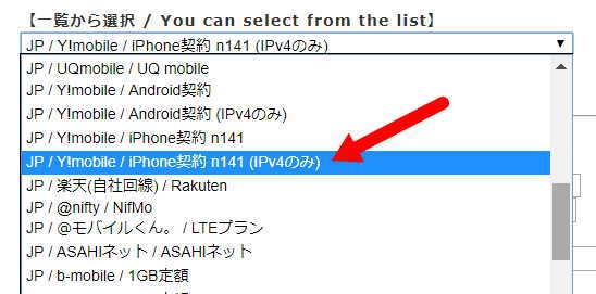 「JP/Y!mobile/iPhone契約 n141(IPv4のみ)」を選択します