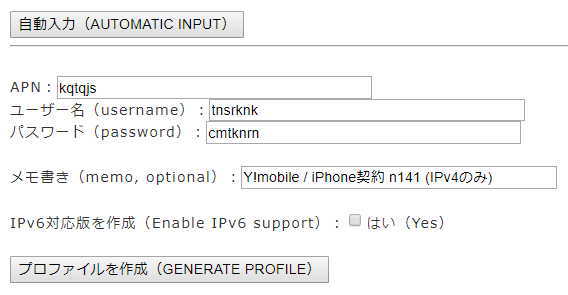- 手動入力のホームページ・・iOS用APN構成プロファイルジェネレータ