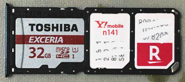 左から、microSD、SIM2(Y!mobileのnanoSIM)、SIM1(楽天のnanoSIM)