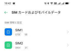 - 電源をONして「設定」>「SIMカードおよびモバイルデータ」を開くとSIM1のみの表示だったのが、SIM1とSIM2が表示されるようになります