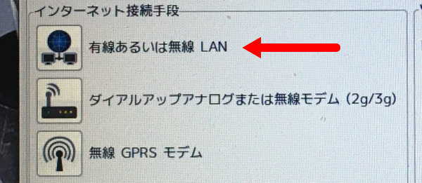 - インターネット接続手段の画面が表示されるので、「有線あるいは無線LAN」のアイコンをクリックします