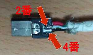 | まずMicroUSB端子の周りのプラスティックと金属カバーをニッパーで剥ぎ取りました。 5個ある端子のうち、4番端子には配線されていません。 1番・・・電源プラス(赤) 2番・・・信号線-(白) 3番・・・信号線+(緑) 4番・・・空き 5番・・・電源マイナス(黒) 端子の種類により、並びや番号が異なるようです。 空きの4番端子と配線の色で多少は判断できると思います。 |