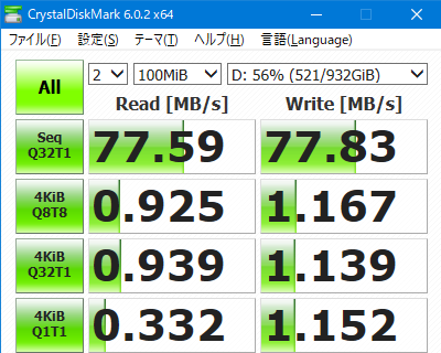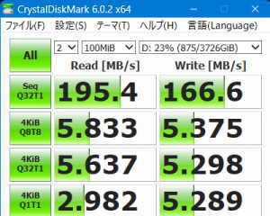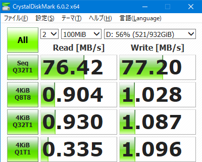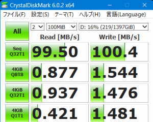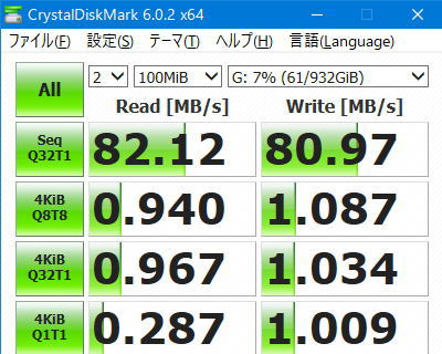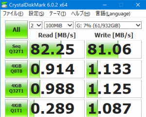2016年にCrystalDiskMarkで測定したものなので、バージョンアップで測定方法や表示が変わる可能性があります。