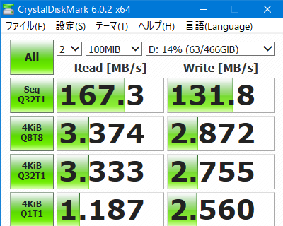 2014年のCrystalDiskMarkで測定したものなので、バージョンアップで測定方法や測定値が変わる可能性があります。