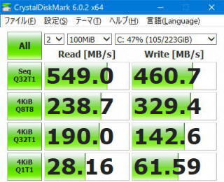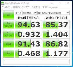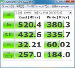 ただし、このパソコンの転送速度は SATA2.0(300Mbps) なので、最大転送速度がネックになり、SSDの最大速度が半減しています。