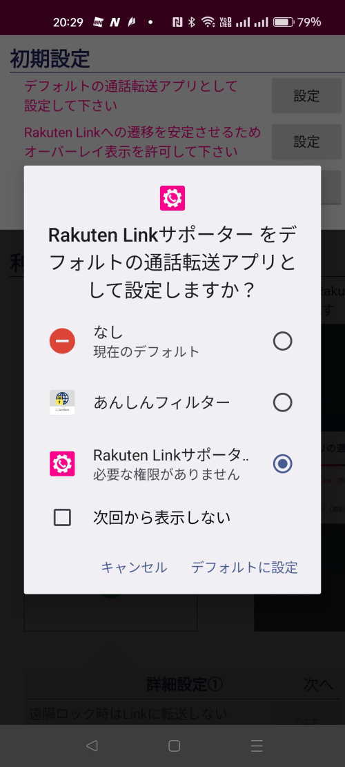 - 「Rakuten Link」は「デフォルトのアプリ」の「電話アプリ」に設定できませんので「Rakuten Link サポーター」を使用します