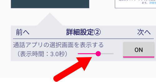- 詳細設定②の画面の赤い矢印の先をスライドして時間を変更します