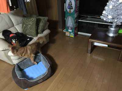 | クリスマスの夜、ワンちゃん用のケーキを食べてのんびりくつろいでいる。 | ![]() |