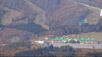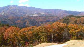 ひるがの高原のサービスエリアからの眺めはすごい紅葉。遠くのスキー場ではスロープ周りの樹木がきれいだった。