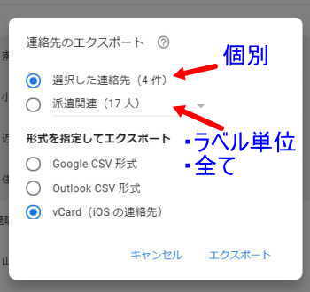 私はiPhoneで使用しやすい vCard を指定しています - 「エクスポート」をクリックし、保存先とファイル名を指定して出力します