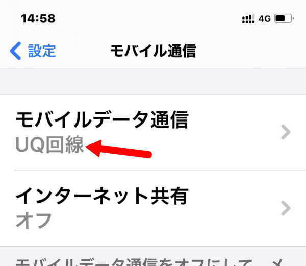- 「設定」の「モバイル通信」で、「モバイルデータ通信」にUQmobileを指定し、Webの閲覧やYouTube等はUQmobileを使うように設定していました