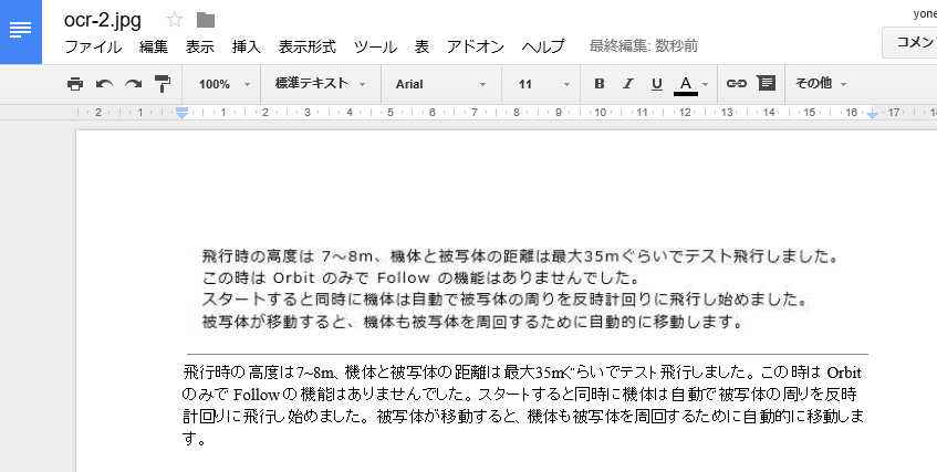 | サンプル画像B(日本語)のGoogle Docsからコピーしたテキスト スペースの抜けは有りましたが、文字認識率は100%でした。 |