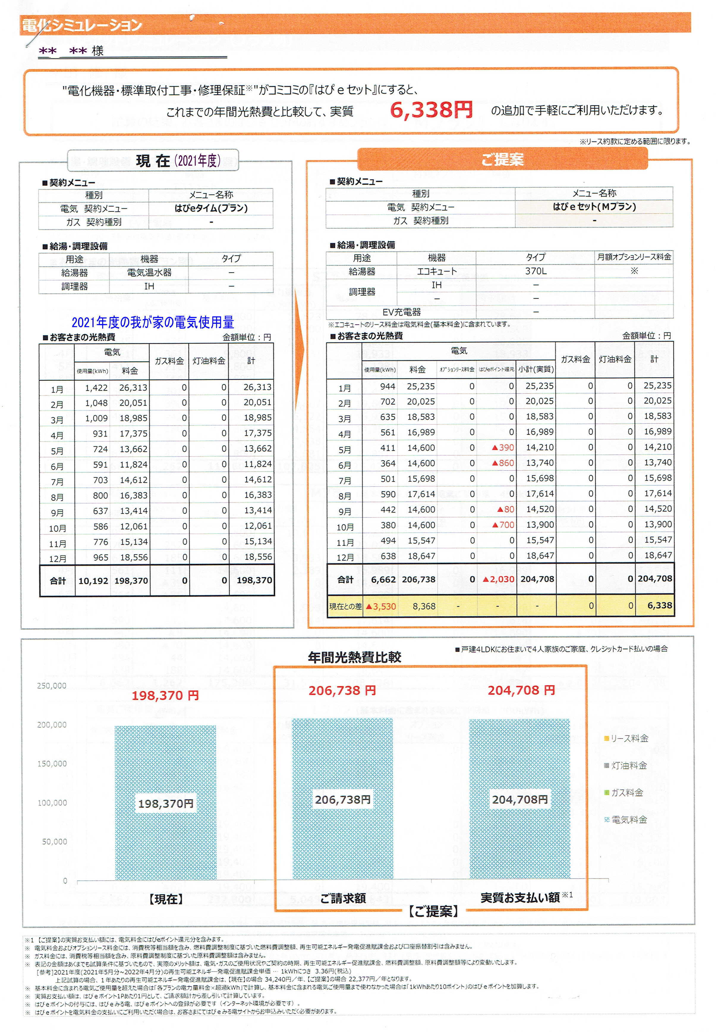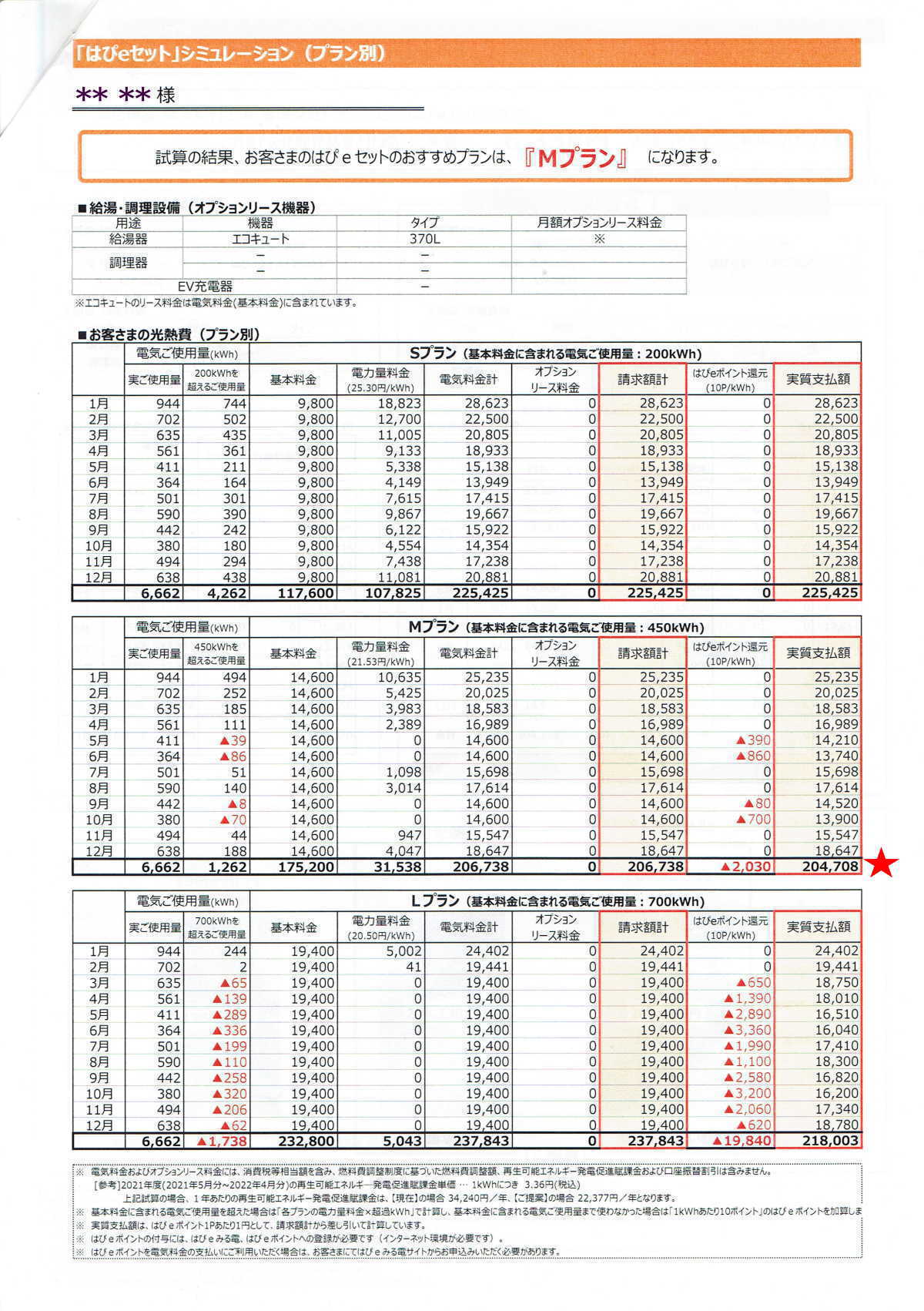 「はぴeプラン」で契約していた2021年度の年間電力使用量をもとに、「はぴeセット」の料金を試算した提案書を2022年10月に持ってこられました。