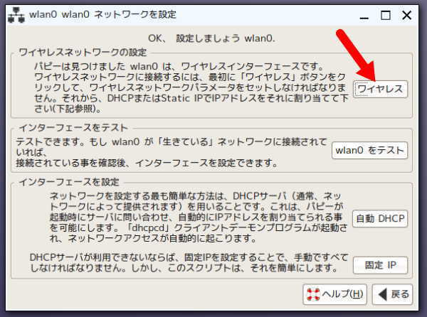 - ワイヤレスの行をクリックして選択し「wlan0」をクリックします。
