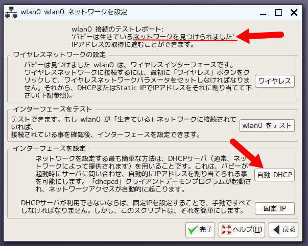 見つかった時は「自動 DHCP」をクリックして実行します。