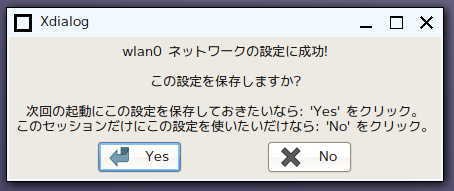 - 無線LANへの接続設定が成功した時は、「Yes」をクリック