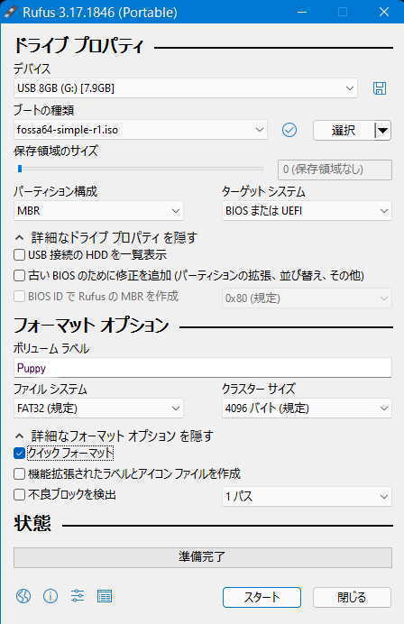 - 以上で、Puppy起動用USBメモリが出来上がります