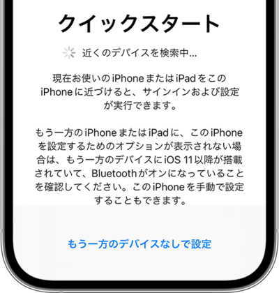 - 新しい iPhone の電源を入れ設定を進め、「クイックスタート」画面に進んだら、