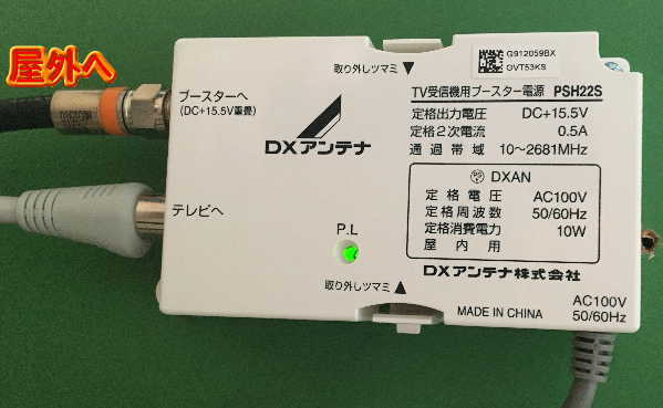 ブースターは屋外に設置され、室内にはブースターへの電源が設置され、ブースターへと書かれた端子から出た同軸が外に繋がれています。