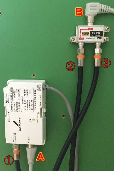 ①屋外のブースターへ、②と③は屋内のTVや2分配器へ