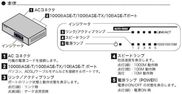- 1,000BASE-T 対応、5ポート