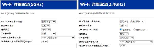 - 5GHz と 2.4GHz の設定画面の一部です