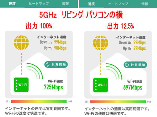 - リビング内では、100%出力と比較し速度の変化が殆どない