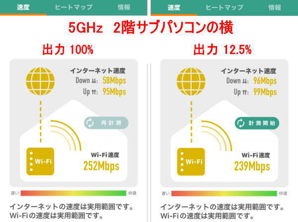 - リビング内では、100%出力と比較し50~80%の速度となりました