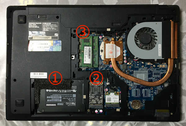 ①2.5インチのSSD/HDD、②mSATAタイプのSSD、③メモリスロット2個
