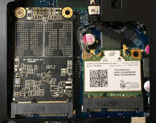 ② mSATAタイプの120GB SSD と 右は WiFiユニット