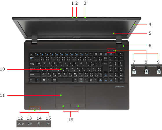 ⑫電源ランプ、⑬バッテリー充電ランプ 、⑭HDDアクセスランプ、⑮機内モードランプ