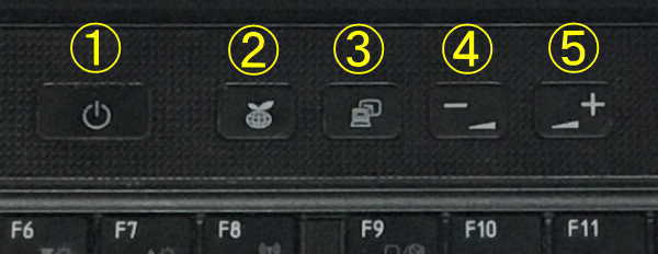 ①電源ボタン、②「節電ボタン」、③「東芝プレゼンテーション」