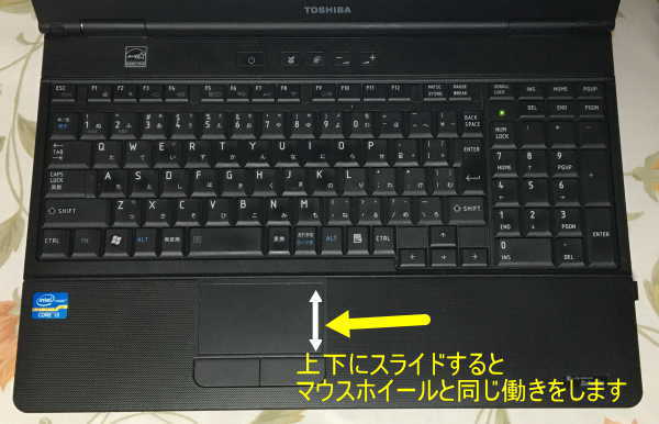 テンキー付きのキーボード。白い矢印のようにマウスパッドの右端を上下にスライドすると、マウスホイールと同じ働きをします。