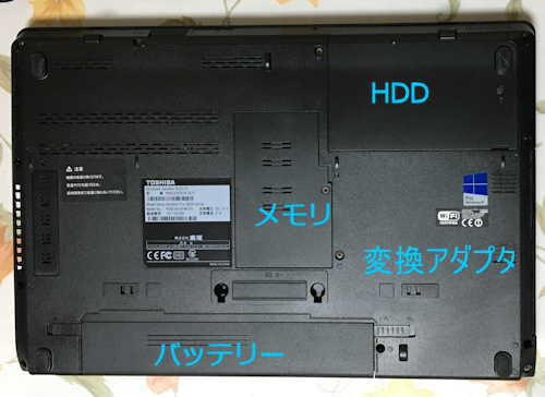 - 底面のHDD、メモリ、デュアルドライブ用変換アダプタ