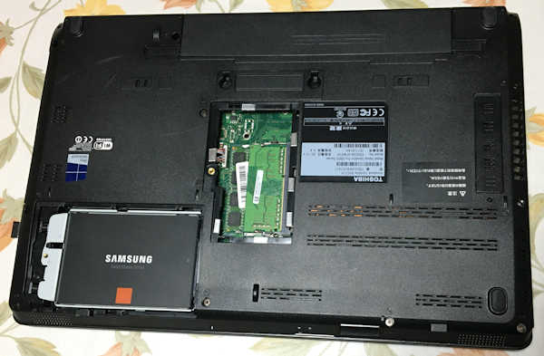 DVDのスペースにHDD変換アダプタを付けて、SSD+HDDのデュアルドライブにしています。