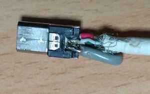 | まずMicroUSB端子の周りのプラスティックと金属カバーをニッパーで剥ぎ取りました。 5個ある端子のうち、4番端子には配線されていません。 1番・・・電源プラス(赤) 2番・・・信号線-(白) 3番・・・信号線+(緑) 4番・・・空き 5番・・・電源マイナス(黒) 端子の種類により、並びや番号が異なるようです。 空きの4番端子と配線の色で多少は判断できると思います。 |