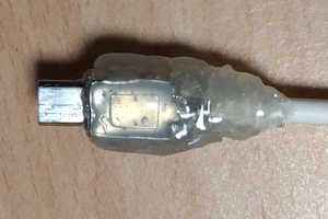 | まず配線の強度を上げるためと、配線間のショートを防ぐためにグルーガンで、配線周りを固めました。 さらにニッパーで剥ぎ取った金属カバーを大まかにかぶせ、この上からもグルーガンで固めました。 見た目は悪いですが、適度な弾力と滑り止め効果もあります。 |