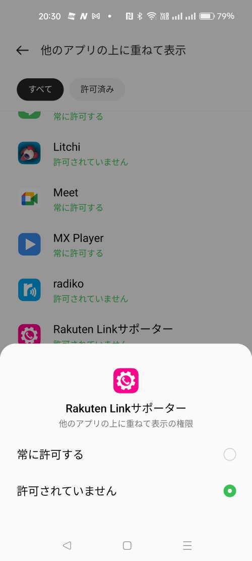 - 初期設定画面の「Rakuten Linkへの遷移を安定させるため、オーバーレイ表示を許可・・」で「設定」をタップ