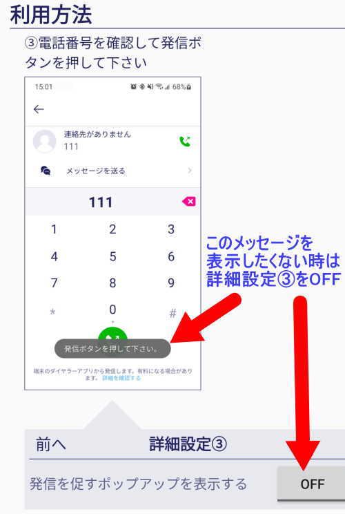 - 発信ボタンの上に「発信ボタンを押してください」という表示をしてほしくない時は、下記のように「OFF」に設定します