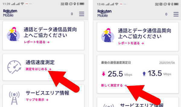 使用するアプリにより測定結果が少し異なるので、「my 楽天モバイル」のメニューにある「通信速度測定」を使用しました。