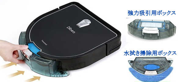 この掃除機は、強力吸引用ダストボックスと水拭き掃除用水タンク付きダストボックスを交換して、実施したい方を取付けて使用します。