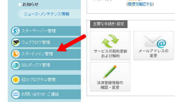 - 左側面のメニュー項目の「スタードメイン管理」をクリック