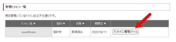 - ドメイン名の右端の「ドメイン管理ツール」をクリック