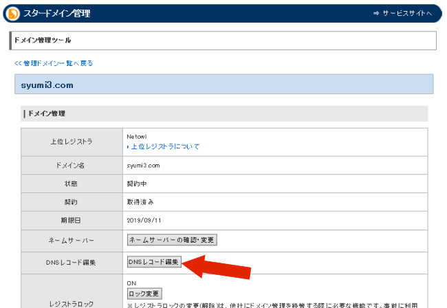 - 「ドメイン管理ツール」の画面の「DNSレコード編集」をクリック