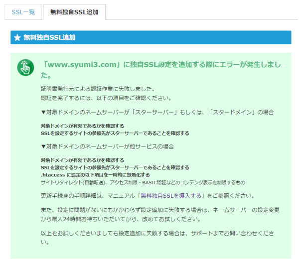 無料独自SSL の 設定が エラーとなる時の対処方法