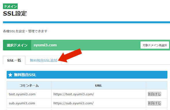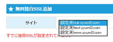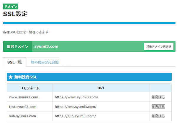 SSL設定の画面に変わり、「★無料独自SSL」の下の一覧には現在SSLが設定されているURLの一覧が表示されます。
